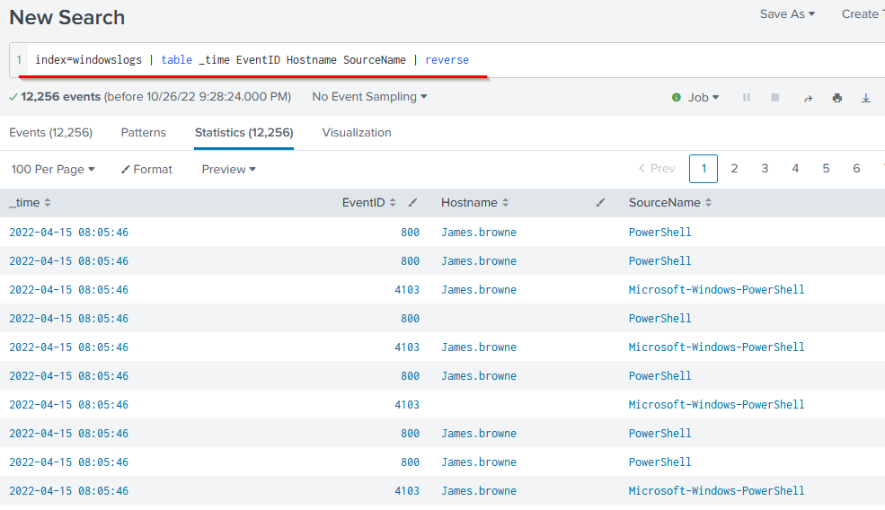 Search Query: index=windowslogs | table _time EventID Hostname SourceName | reverse