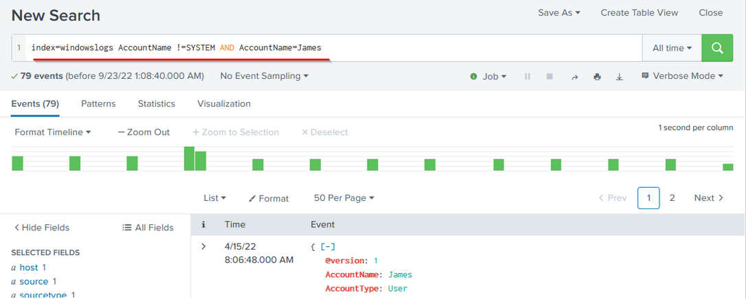 To understand how boolean operator works in SPL, lets add the condition to show the events from the James account.