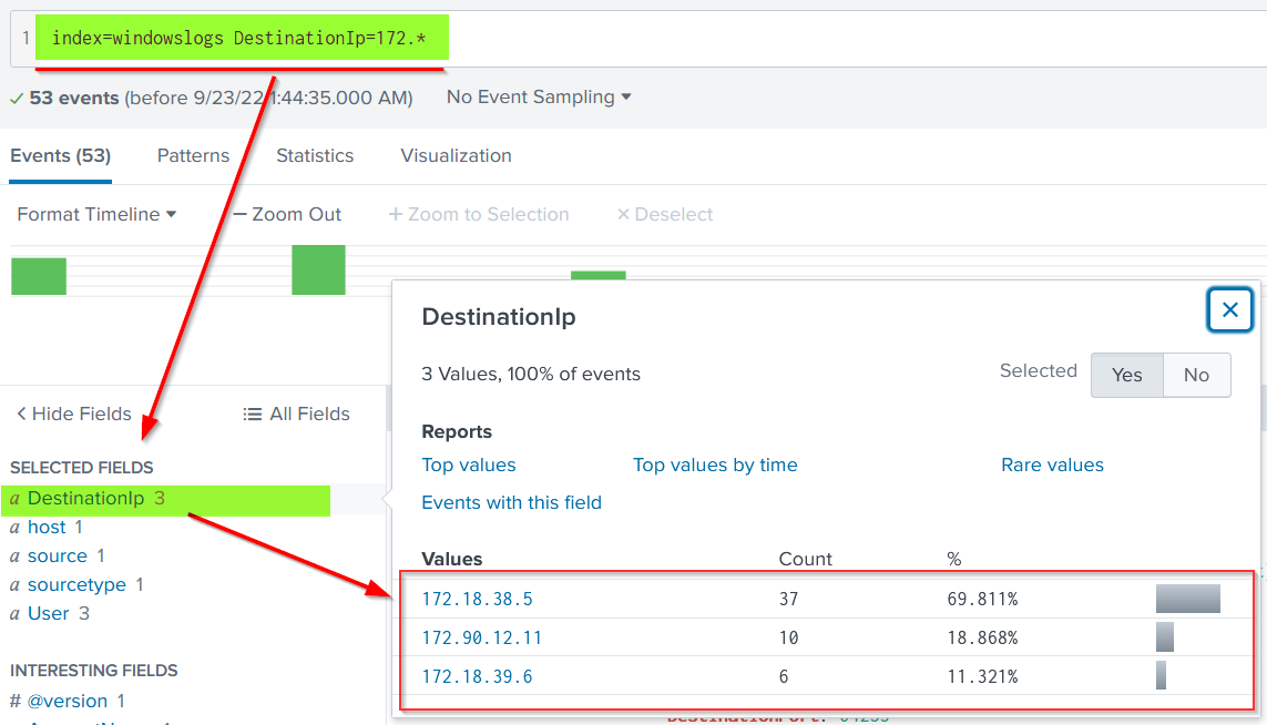 In the events, there are multiple DestinationIPs reported. Let's use the wildcard only to show the DestinationIP starting from 172.*