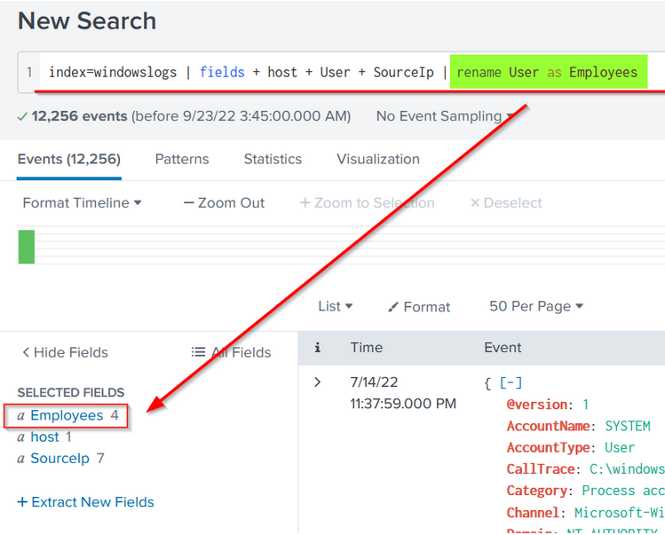 Let's use the fields command to only display host, User, and SourceIP fields using the following syntax.
