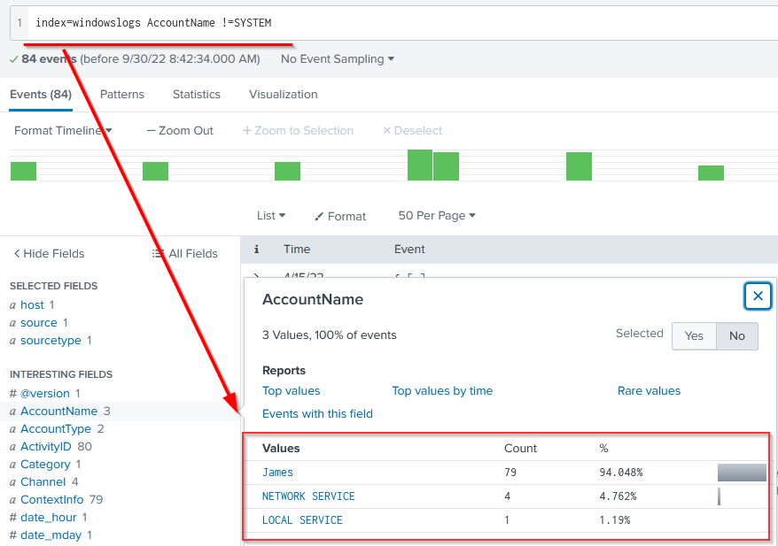 Lets use the comparison operator to display all the event logs from the index "windowslogs", where AccountName is not Equal to "System"